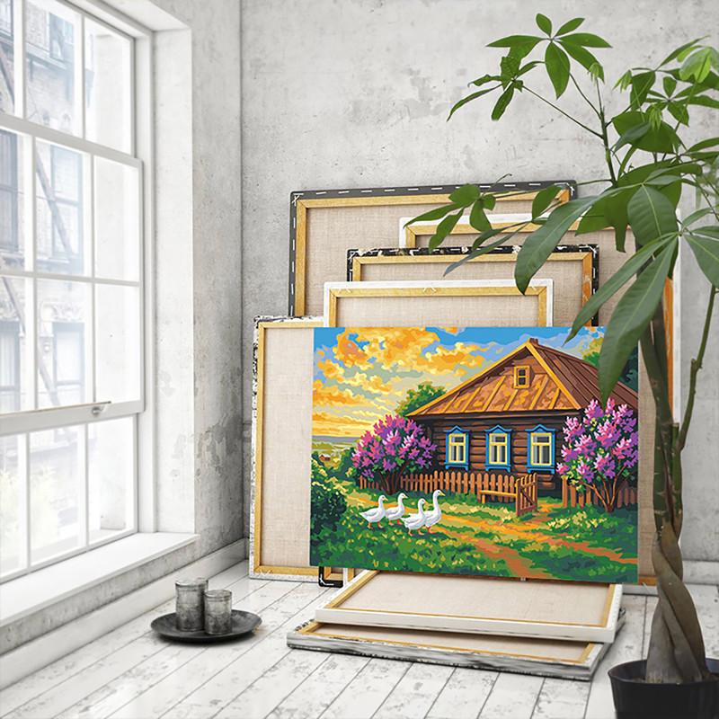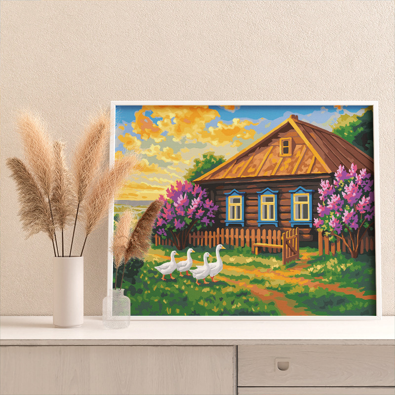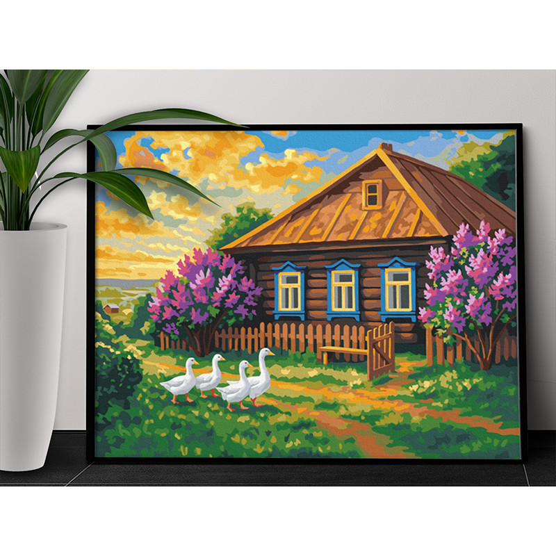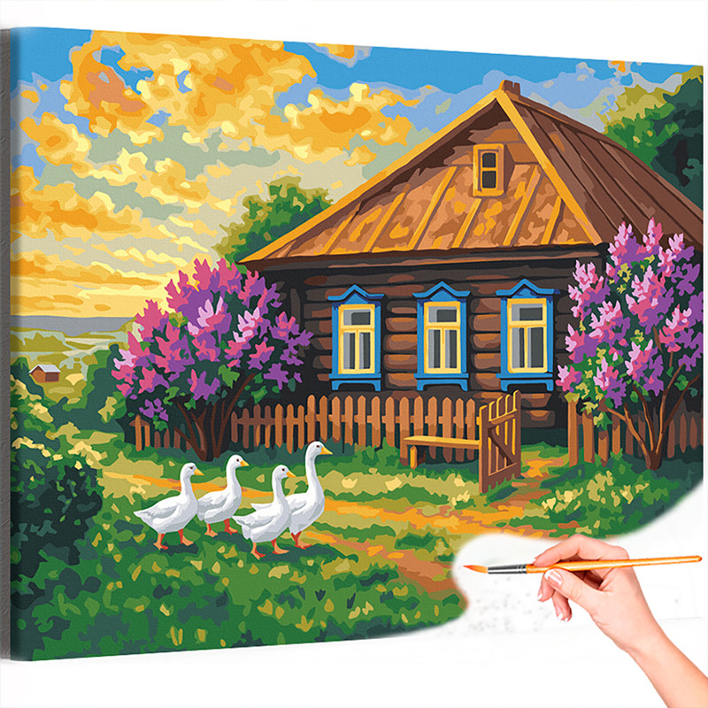 Новое  Домик в деревне Гуси Дом Природа Лето Закат Сирень Пейзаж Раскраска картина по номерам на холсте AAAA-NK1205 Увеличить