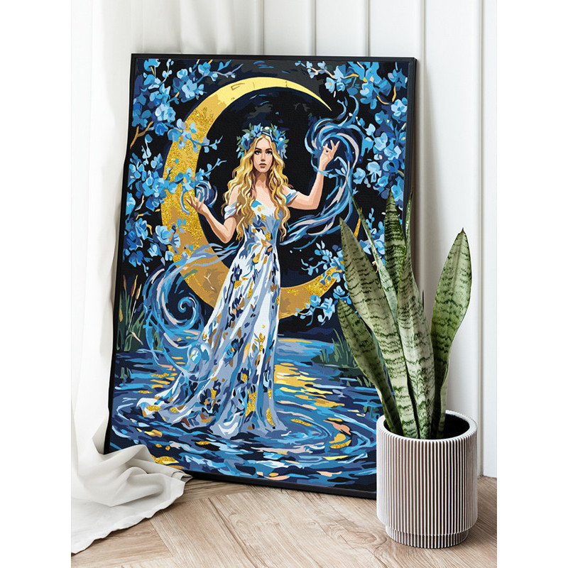Девушка с цветами на фоне луны Темное фэнтези Женщина Ведьма Магия Эзотерика 100х125 Раскраска картина по номерам на холсте с золотой краской