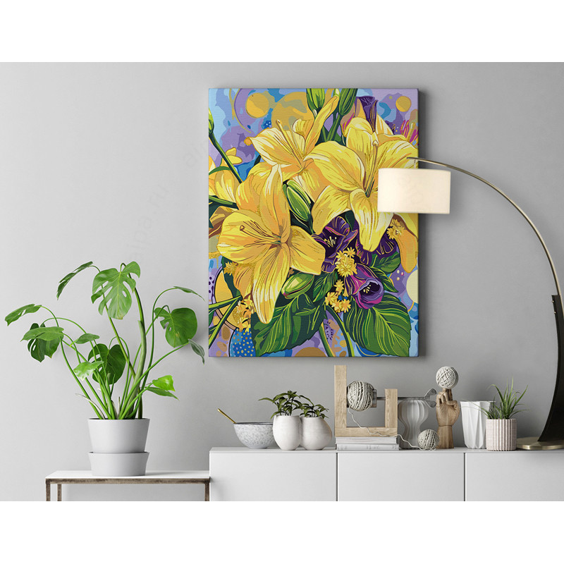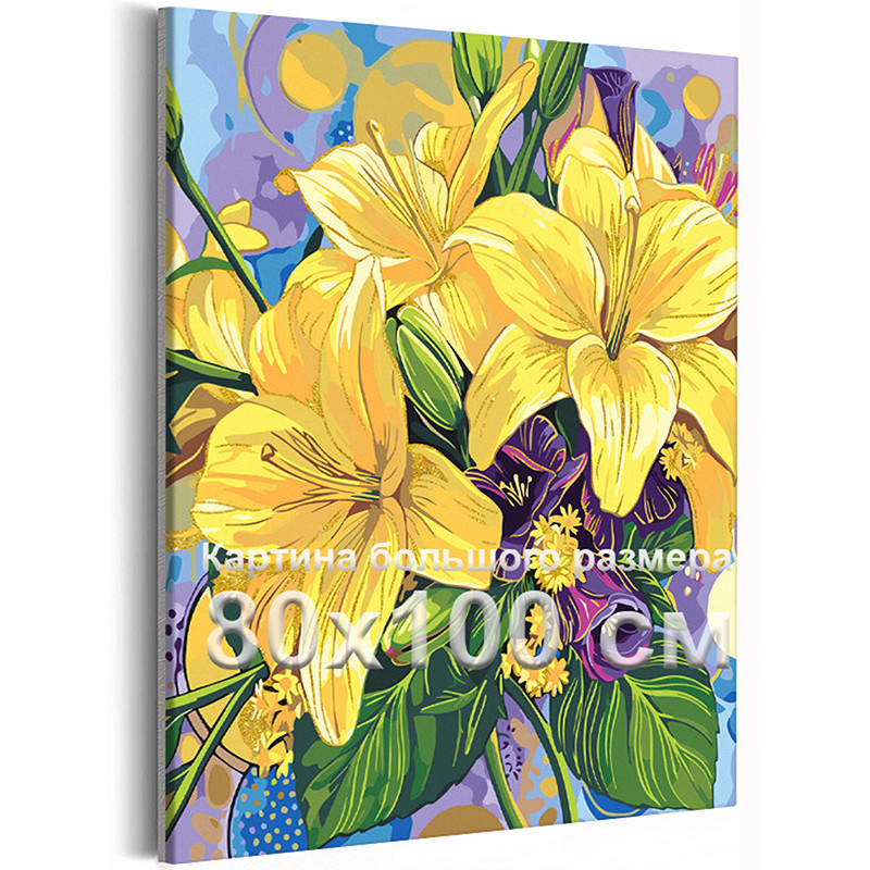 Цветы лилии С золотой краской Букет цветов Яркие 8 марта Для мамы 80х100 Раскраска картина по номерам на холсте с металлической краской