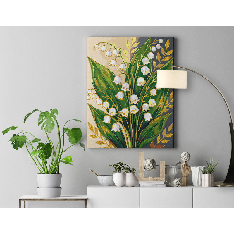 Ландыши с золотой краской Цветы Букет Нежная Легкая Для мамы 8 марта Интерьерная 80х100 Раскраска картина по номерам на холсте с металлической краской AAAA-NK1620-80x100