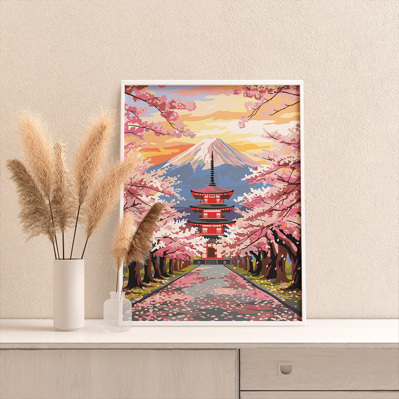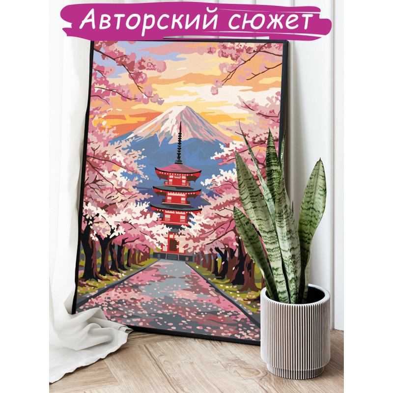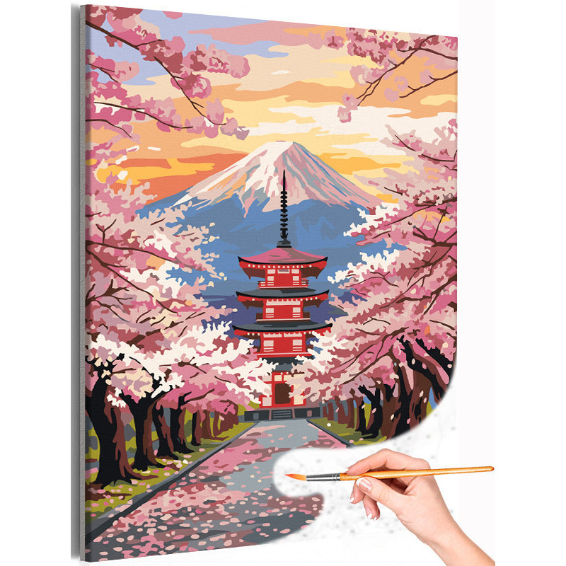 Японский пейзаж с цветущей сакурой и горой Фудзи Японский стиль Весна Япония Рассвет Розовая Раскраска картина по номерам на холсте