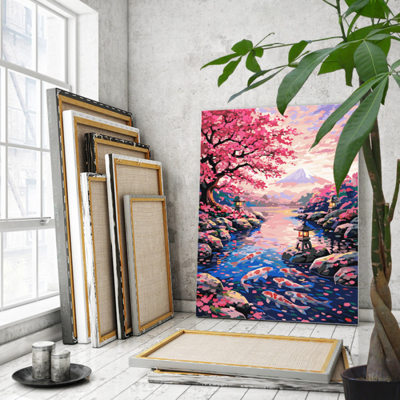 Японский пейзаж с цветущей сакурой и горой Фудзи Японский стиль Пруд и карпы кои Весна Япония Розовая 100х125 Раскраска картина по номерам на холсте AAAA-NK1612-100x125