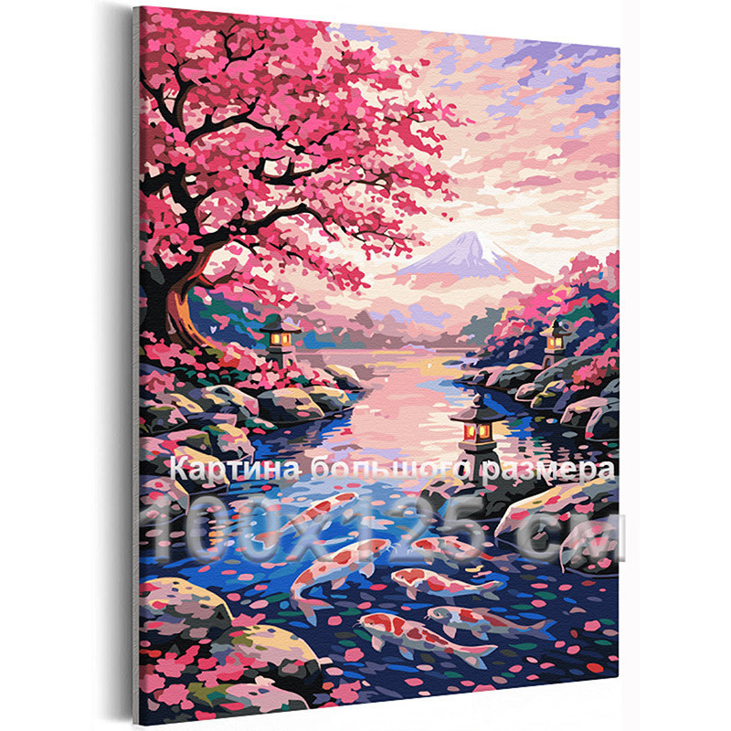 Японский пейзаж с цветущей сакурой и горой Фудзи Японский стиль Пруд и карпы кои Весна Япония Розовая 100х125 Раскраска картина по номерам на холсте