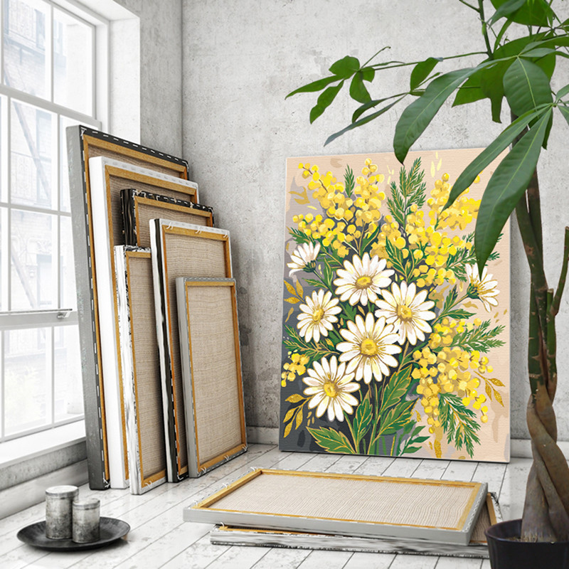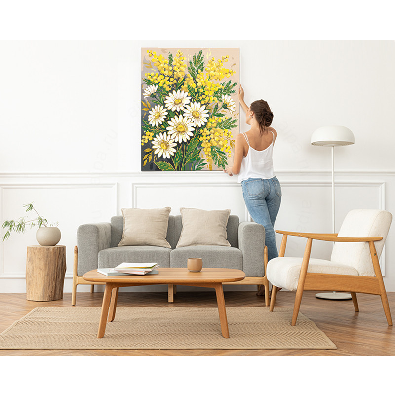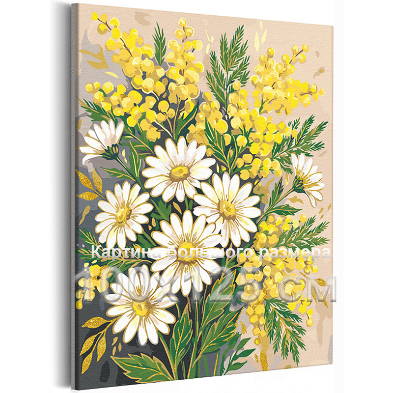 Мимоза и ромашки Цветы с золотой краской Букет Для триптиха Для мамы на 8 марта Весна Интерьерная 100х125 Раскраска картина по номерам на холсте с металличсекой краской