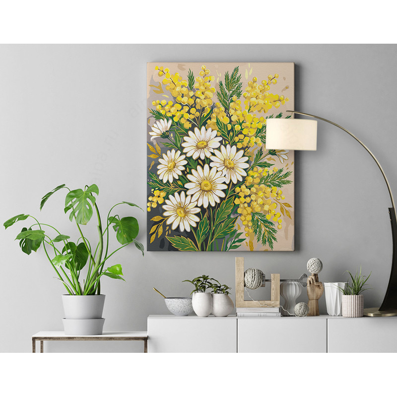 Мимоза и ромашки Цветы с золотой краской Букет Для триптиха Для мамы на 8 марта Весна Интерьерная 100х125 Раскраска картина по номерам на холсте с металличсекой краской AAAA-NK1630-100x125