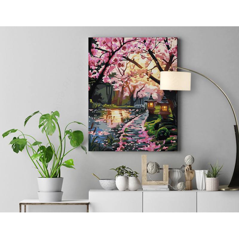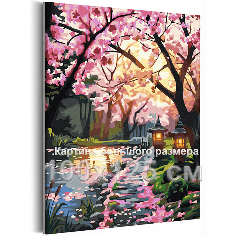 Япония Пейзаж с сакурой сад и пруд Японский стиль Природа Весна Закат 100х125 Раскраска картина по номерам на холсте