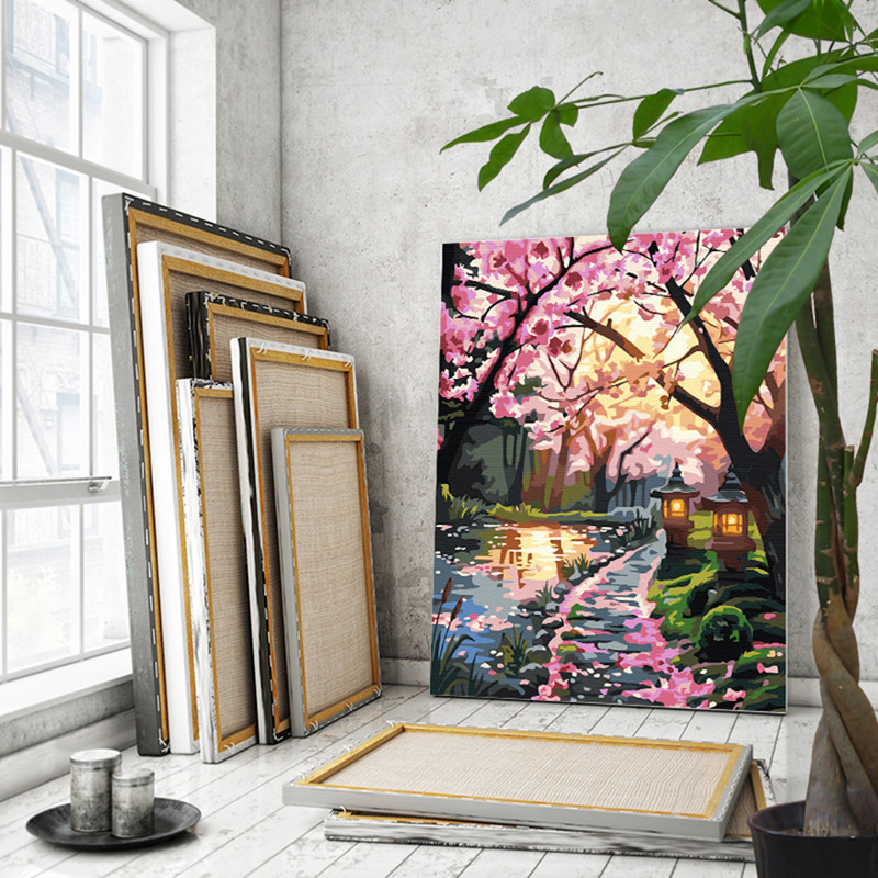 Новое Япония Пейзаж с сакурой сад и пруд Японский стиль Природа Весна Закат 80х100 Раскраска картина по номерам на холсте Увеличить