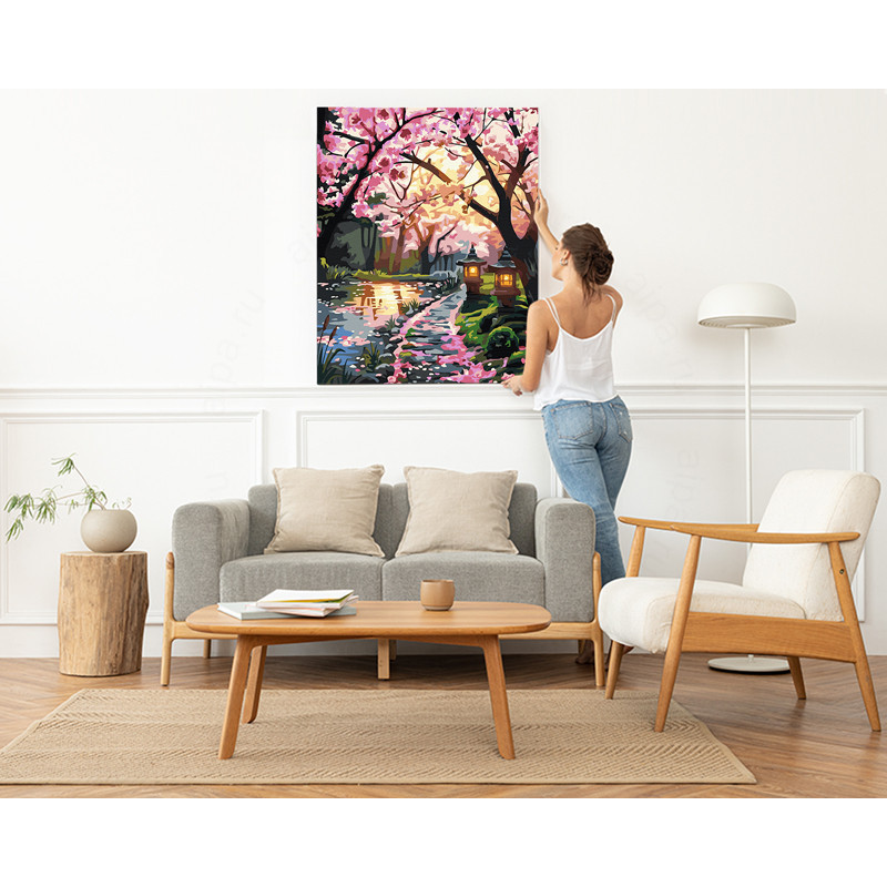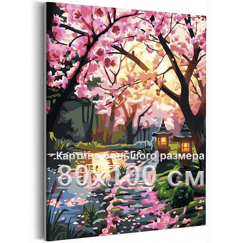Япония Пейзаж с сакурой сад и пруд Японский стиль Природа Весна Закат 80х100 Раскраска картина по номерам на холсте