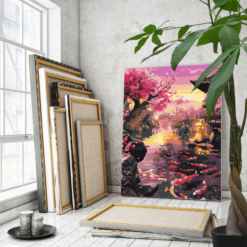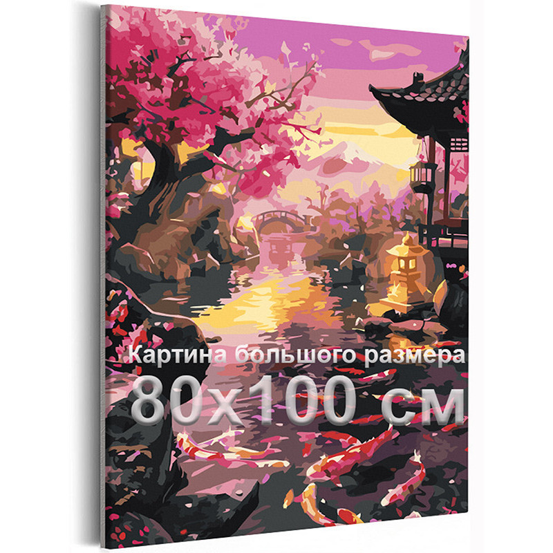 Япония Пейзаж с сакурой и горой Фудзияма Сад и пруд с карпами кои Японский стиль Весна Рыбы 80х100 Раскраска картина по номерам на холсте