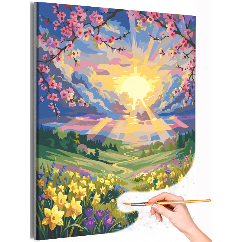 Пейзаж с весенними цветами и сакура Природа Закат Горы Раскраска картина по номерам на холсте