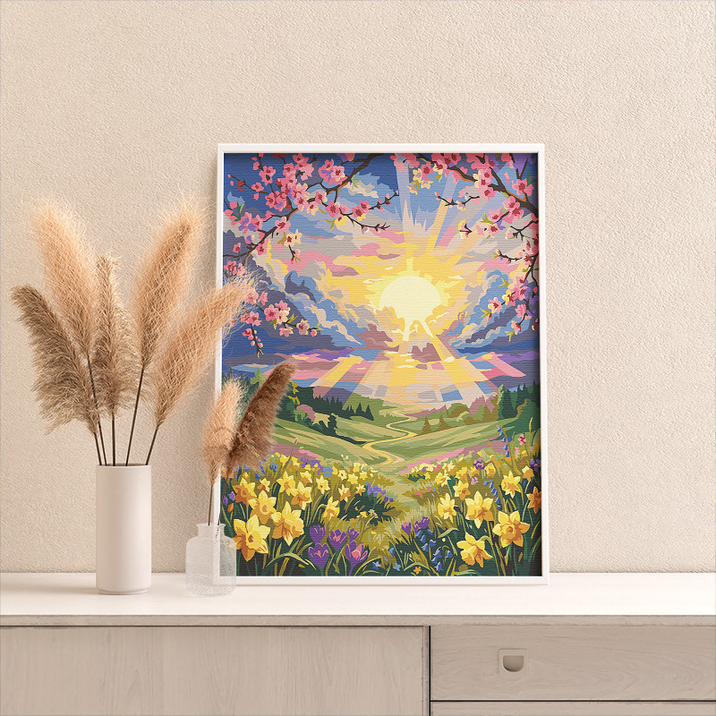 Новое  Пейзаж с весенними цветами и сакура Природа Закат Горы Раскраска картина по номерам на холсте AAAA-NK1636 Увеличить