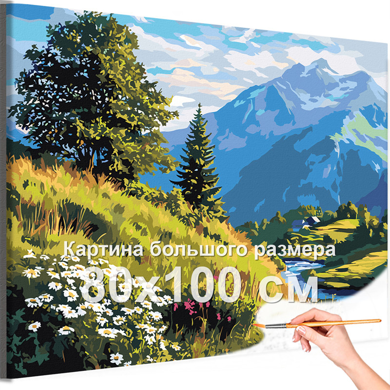 Горы Кавказа река и цветы Пейзаж Природа Россия Лето 80х100 Раскраска картина по номерам на холсте