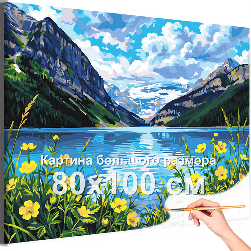 Горы Кавказа и озеро Пейзаж Природа Россия Лето Цветы 80х100 Раскраска картина по номерам на холсте