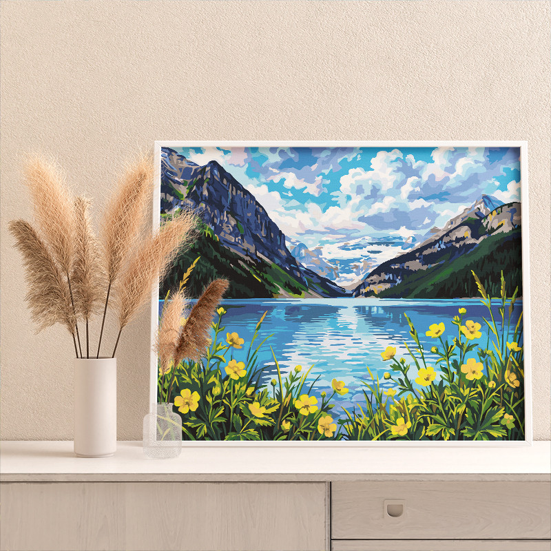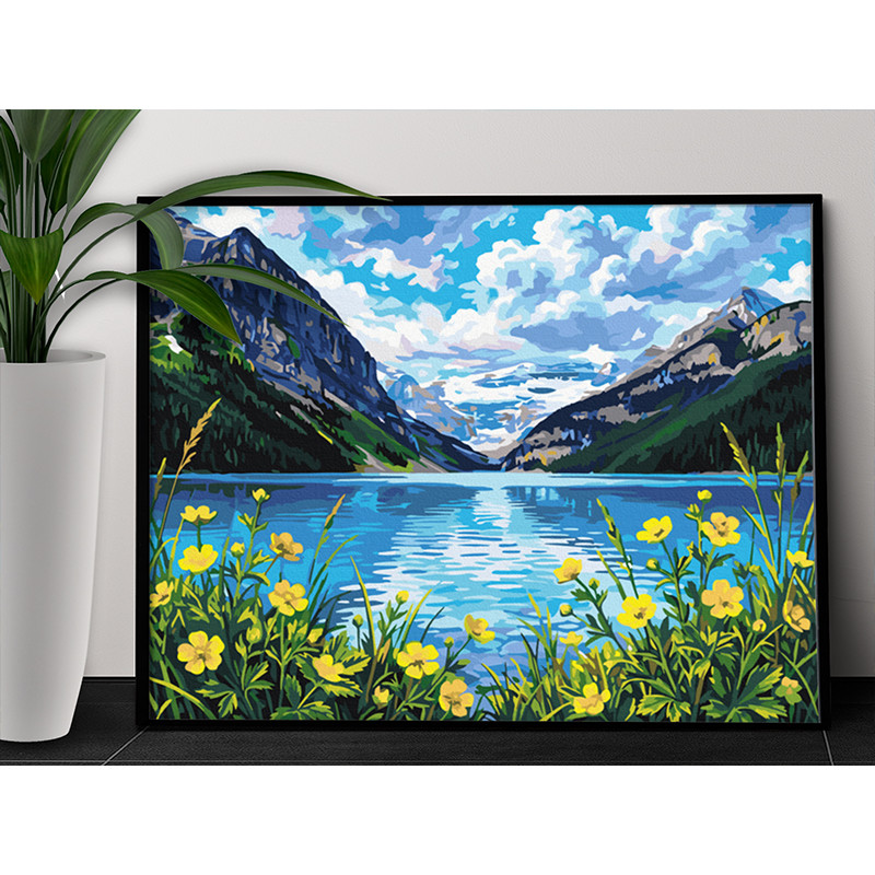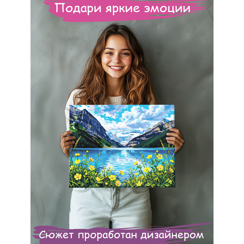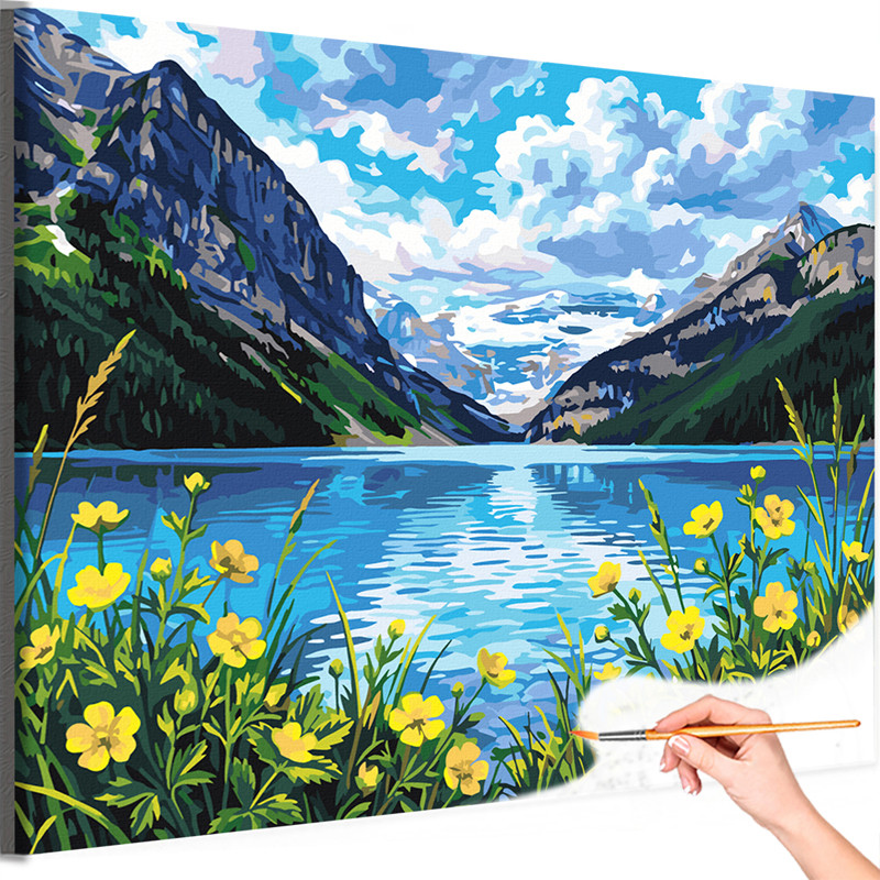 Горы Кавказа и озеро Пейзаж Природа Россия Лето Цветы Раскраска картина по номерам на холсте